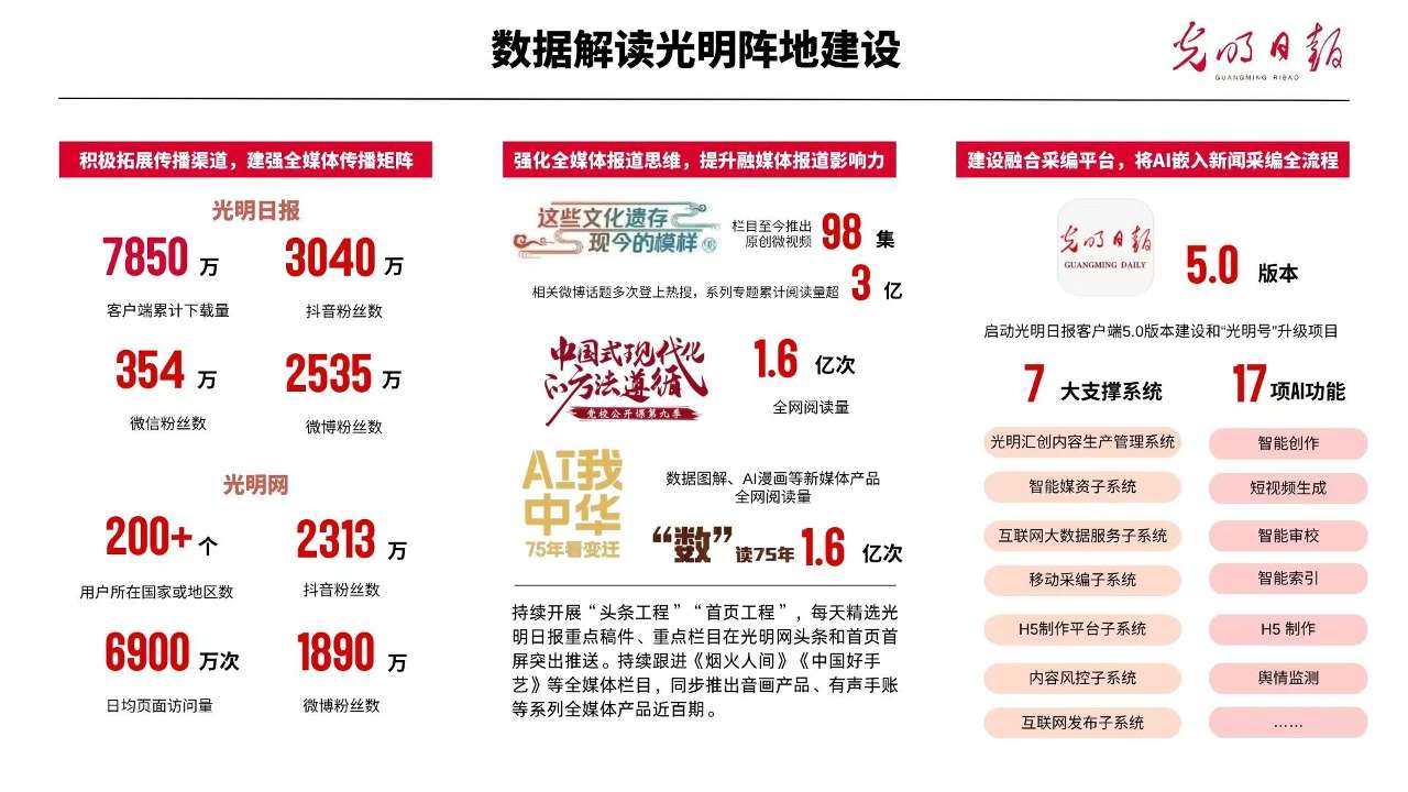近日,2024年度光明日报社会责任报告在光明日报客户端、光明网等平台全文发布。报告从政治责任、阵地建设责任、服务责任、文化责任等方面,全面反映2024年光明日报积极宣传习近平新时代中国特色社会主义思想、党的创新理论和路线方针政策、重大决策部署,立足知识界、面向全社会,坚持与真理同行、与时代同步,团结、联系、引导、服务知识界,承担起媒体应有的社会责任的情况。光明日报同步推出数据新闻作品,“数”说光明日报阵地建设情况。